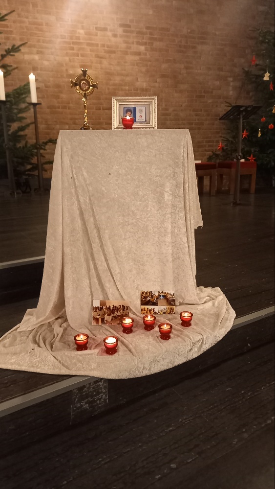 Unten sehen Sie ein Foto von unseren Fürbittkerzen bzw. unseren Gaben nach dem Vorbild der Hl.3 Könige mit den Fotos der Schüler in Nigeria. Oben auf dem Tischchen stehen die Reliquie 1.Grades in der Monstranz und die Reliquie 2. Grades im Bilderrahmen.